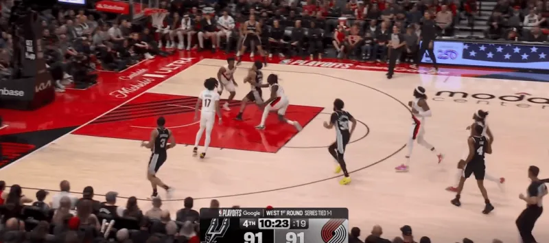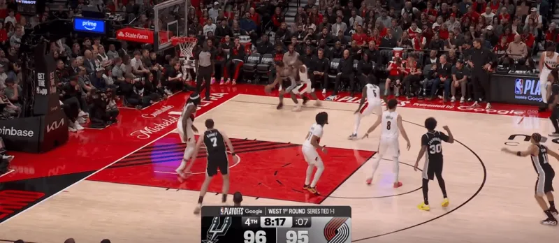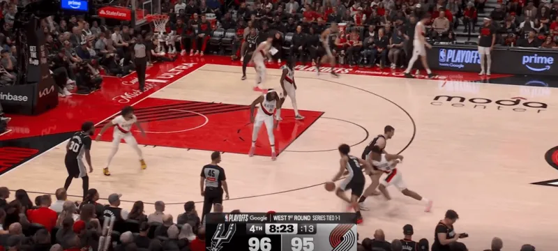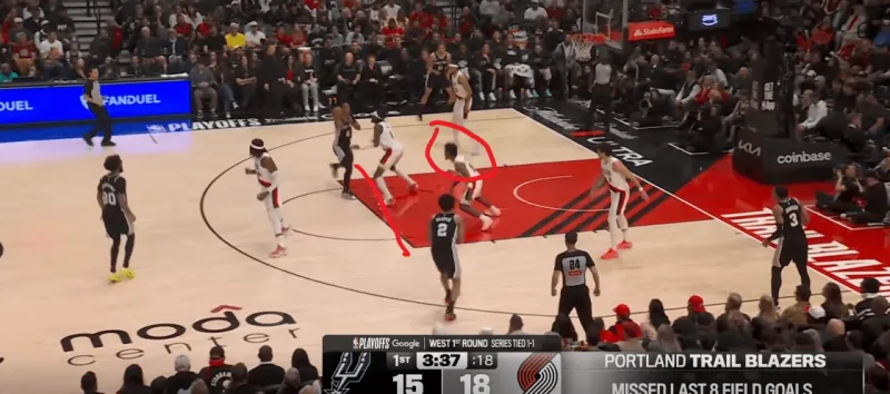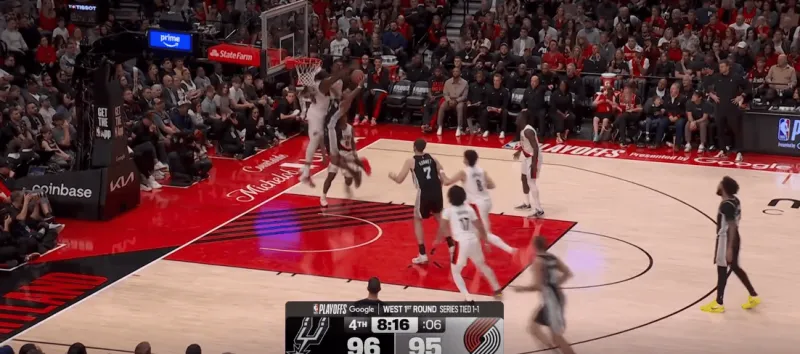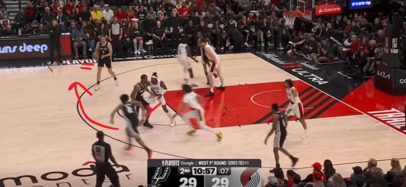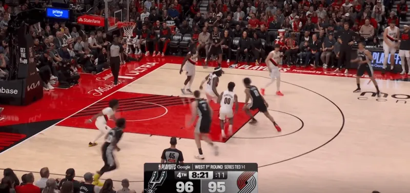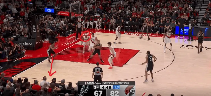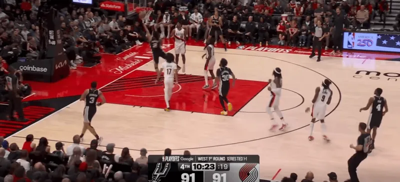 这次转换进攻也体现了哈珀的坚决,开拓者大个子未能第一时间退防篮下,哈珀背转身过掉霍乐迪后直接杀入禁区,面对亨德森的刷卡起飞完成上篮: